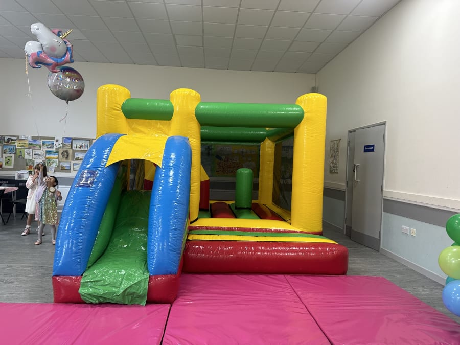 This multicoloured Activity Play Bouncy Castle is a fantastic choice for parties for toddlers up to 5 years of age. Its stimulating bright colours with built in play features will impress and entertain mini party guests for hours! The netted sides surrounding this bouncy castle allow for easy viewing so parents and guardians can safely and easily view their little ones as they play together independently. Inside of the Inflatable are 3 Bish Bash posts and 2 Inflatable Hoops, these add another element of fun to bounce between, around or to crawl through and endless fun of bouncing and sliding down the slide.